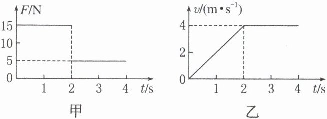 BC 解析 根据$v - t$图像的斜率等于加速度,可知前2s内物体运动的加速度为$a=\frac{\Delta v}{\Delta t}=\frac{4}{2}m/s^{2}=2m/s^{2}$,A项错误;根据$v - t$图像可知,前4s内物体的位移为$x=\frac{1}{2}\times2\times4m + 2\times4m = 12m$,B项正确;根据牛顿第二定律得,前2s内有$F_{1}-\mu mg = ma$,后2s内有$F_{2}=\mu mg$,由题图甲可知$F_{1}=15N$,$F_{2}=5N$,联立解得$m = 5kg$,$\mu = 0.1$,C项正确,D项错误。