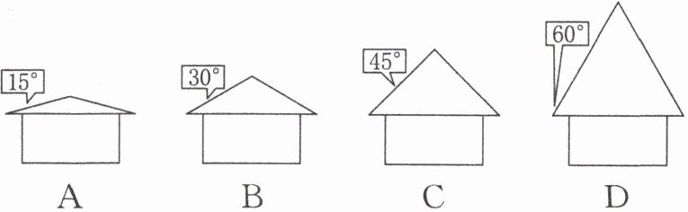C 解析 如图,设房顶宽为2b,高度为h,斜面倾角为θ。由图中几何关系有h=btanθ,由运动学关系可得t=$\frac{1}{\sin\theta}$ $\sqrt{\frac{2h}{g}}$,联立解得t= $\sqrt{\frac{4b}{g\sin2\theta}}$,可见,当θ=45°时,t最小,C项正确。