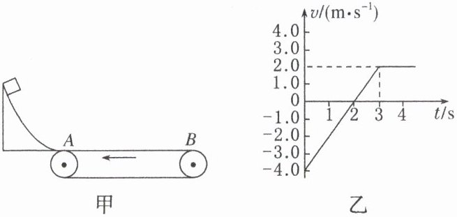 BC 解析 由题图乙可得,物块做匀变速运动的加速度大小为a=$\frac{\Delta v}{\Delta t}$=2.0m/s²,由牛顿第二定律得Ff=ma=μmg,则可得物块与传送带间的动摩擦因数μ = 0.2,A项错误,B项正确;在v - t图像中,图线与t轴所围面积表示物块的位移,则物块经减速、反向加速到与传送带相对静止,最后匀速运动回到传送带左端时,物块的位移为0,由题图乙可得物块在传送带上运动的总时间为4.5s,C项正确,D项错误。