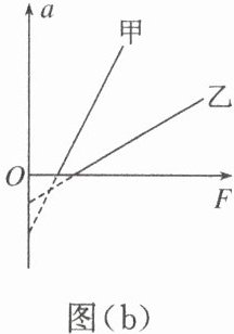 (3)甲、乙两同学在同一实验室,各取一套如图(a)所示的装置放在水平桌面上,木块上均不放砝码,在没有平衡摩擦力的情况下,研究加速度$a$与拉力$F$的关系,分别得到图(b)中甲、乙两条直线。设甲、乙用的木块质量分别为$m_{甲}$、$m_{乙}$,甲、乙用的木块与木板间的动摩擦因数分别为$\mu_{甲}$、$\mu_{乙}$,由图可知,$m_{甲}$________$m_{乙}$,$\mu_{甲}$________$\mu_{乙}$。(均填“大于”“小于”或“等于”)