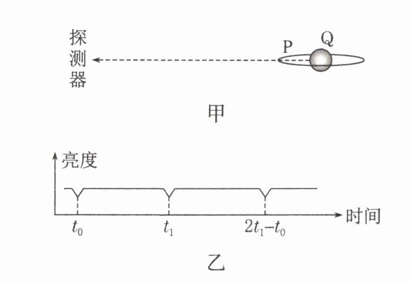 B 解析 由题图乙可知探测器探测到Q的亮度随时间变化的周期为$T = t_{1}-t_{0}$,则P的公转周期为$t_{1}-t_{0}$,A项错误;P绕恒星Q做匀速圆周运动,由万有引力提供向心力可得$\frac{GMm}{r^{2}}=m\frac{4\pi^{2}}{T^{2}}r$,解得半径为$r=\sqrt[3]{\frac{GMT^{2}}{4\pi^{2}}}=\sqrt[3]{\frac{GM(t_{1}-t_{0})^{2}}{4\pi^{2}}}$,B项正确;P的角速度为$\omega=\frac{2\pi}{T}=\frac{2\pi}{t_{1}-t_{0}}$,C项错误;P的加速度大小为$a=\omega^{2}r=(\frac{2\pi}{t_{1}-t_{0}})^{2}\cdot\sqrt[3]{\frac{GM(t_{1}-t_{0})^{2}}{4\pi^{2}}}=\frac{2\pi}{t_{1}-t_{0}}\cdot\sqrt[3]{\frac{2\pi GM}{t_{1}-t_{0}}}$,D项错误。