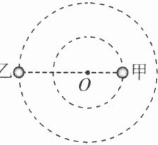 CD 解析 因为甲、乙做圆周运动的向心力均由二者之间的万有引力提供,所以向心力大小相等,又因为两天体绕O点做匀速圆周运动的周期相同,所以角速度相同,根据向心力公式有m₁ω²r₁ = m₂ω²r₂,解得m₁ : m₂ = r₂ : r₁ = 3 : 2,A、B两项错误,D项正确;根据牛顿第二定律有G$\frac{m_{1}m_{2}}{L^{2}}$ = m₁$\frac{4\pi^{2}}{T^{2}}$r₁ = m₂$\frac{4\pi^{2}}{T^{2}}$r₂,两颗星之间的距离为L = r₁ + r₂,联立以上两式解得m₁ + m₂ = $\frac{4\pi^{2}L^{3}}{GT^{2}}$,C项正确。
