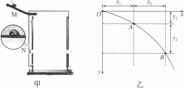 (2)描出小球平抛运动的轨迹如图乙所示,$O$为抛出点,$A$、$B$为轨迹上的两点,$OA$、$AB$竖直方向高度分别为$y_1$、$y_2$,按照自由落体规律,若$y_1:y_2 =$______,则$OA$、$AB$段时间间隔相等;在误差允许的范围内,若$x_1:x_2 =$______,则说明小球在水平方向上的分运动是匀速直线运动。