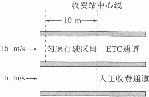 【典例9】(教材原题)ETC是高速公路上不停车电子收费系统的简称。如图所示,汽车以15 m/s的速度行驶,如果过人工收费通道,需要在收费站中心线处减速至0,经过20 s缴费后,再加速至15 m/s行驶;如果过ETC通道,需要在中心线前方10 m处减速至5 m/s,匀速到达中心线后,再加速至15 m/s行驶。设汽车加速和减速的加速度大小均为1 m/s²。