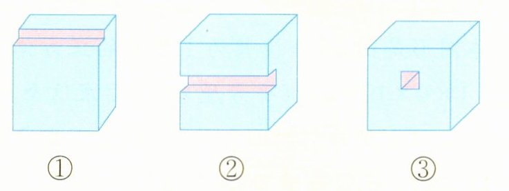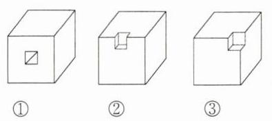 **思路点拨** 这是一道开放题,挖去小长方体的方式有多种:(1)如图①所示,沿一条棱挖;(2)如图②所示,在某个面挖;(3)如图③所示,挖通某两个对面。