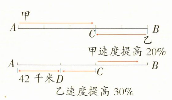 由题意画出示意图,把 A、B 间的路程平均分成 5 份,甲、乙原来的速度比是 3 : 2,第一次在 C 地相遇,甲行 3 份路程,乙行 2 份路程。在 C 地相遇后,甲、乙的速度比为$[3×(1 + 20\%)] : [2×(1 + 30\%)] = 18 : 13$,甲到达 B 地还需行 2 份路程,同时乙行了$2÷18×13 = 1\frac{4}{9}$(份)路程。A、D 间相距 42 千米,所对应的是相遇前甲所行路程与相遇后乙所行路程的差,即$(3 - 1\frac{4}{9})$份,从而推算出 A、B 的长。