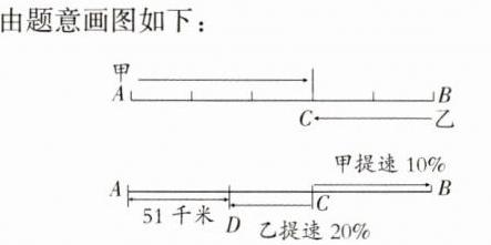 甲、乙的原速度比为3:2,在C地相遇后,甲、乙的速度比为[3×(1 + 10%)]:[2×(1 + 20%)]=11:8,甲由C地到B地行2份路程,乙行2÷11×8 = 1$\frac{5}{11}$(份),A、B两地相距51÷(3 - 1$\frac{5}{11}$)×5 = 165(千米)。