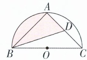 4. 如图,直径$BC = 8$cm,$AB = AC$,$D$为$AC$的中点,求涂色部分的面积。