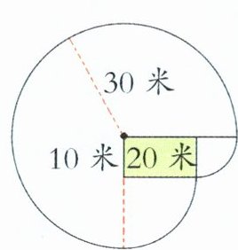 1. 草场上有一个长$20$米、宽$10$米的关闭着的羊圈,在羊圈的一角用一根长$30$米的绳子拴着一只羊,如图,请问这只羊能够活动的范围有多大?