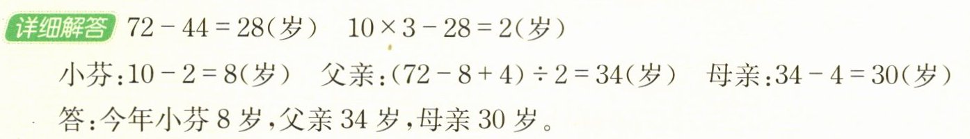 小芬家由小芬和她的父母组成,小芬的父亲比小芬的母亲大4岁,今年全家人的年龄和是72岁,10年前全家人的年龄和是44岁,今年三人各是多少岁?