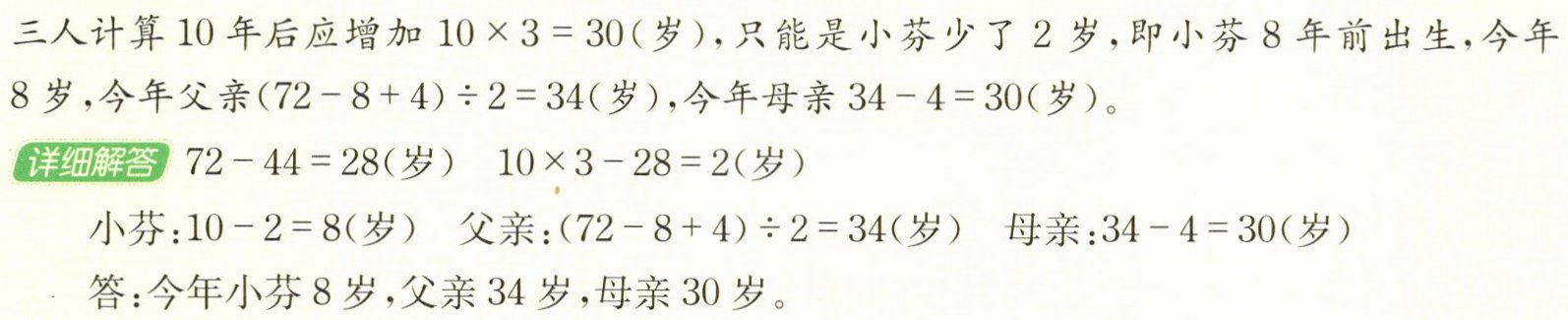 1. 小明一家三口,爸爸比妈妈大3岁,他们全家今年的年龄加起来正好是58岁,而5年前他们全家的年龄加起来刚好是45岁。小明今年多少岁?