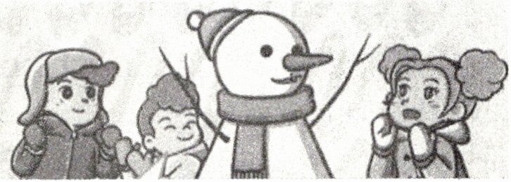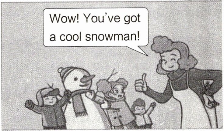 It’s a snowy day. Let’s make a snowman. Look, he has got a big black mouth. He has got a small red nose. He has got two big green eyes. He has got a green hat and a blue scarf. What a nice snowman!