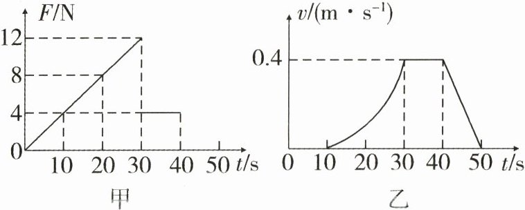 C [解析]在 10~30 s 内,由图甲可知,拉力逐渐增大,由图乙可知,物体运动的速度逐渐增大,不知道物体运动的距离,根据$W = Fs$可知,拉力做的功无法计算,A 错误;在 50 s 内,由图甲可知,拉力在变化,不知道物体运动的路程,由$W = Fs$可知,无法计算拉力做的功,B 错误;在 10~30 s 内,由图甲可知,拉力逐渐增大,由图乙可知,物体运动的速度逐渐增大,根据功率$P = \frac{W}{t} = \frac{Fs}{t} = Fv$可知,拉力的功率逐渐变大,C 正确;在 30~40 s 内,由图甲可知,拉力的大小不变,由图乙可知,物体运动的速度不变,根据功率$P = \frac{W}{t} = \frac{Fs}{t} = Fv$可知,拉力的功率不变,D 错误.