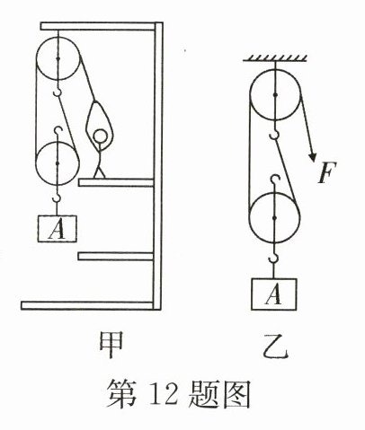 12. 俊星家周末乔迁新居,因家中柜子搬运不方便,所以俊星提出利用滑轮组来完成,其设计方案如图甲所示. 图乙为滑轮组的连接方式,已知柜子A的重力为740 N,动滑轮的重力为60 N,柜子匀速下降的竖直高度为6 m,下降过程用时1 min(不计绳重与摩擦). 俊星对此工作过程及装置作出以下判断,其中正确的是 ( )