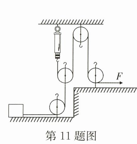 11. (2022·抚顺中考)使用如图所示的滑轮组,沿水平方向匀速拉动质量为300 kg的物体,弹簧测力计的示数为200 N,物体在10 s内移动了1 m. 物体所受的摩擦力为物重的0.1倍. 不计绳重和滑轮组内的摩擦,下列说法正确的是(g取10 N/kg) ( )