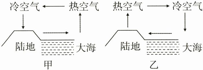14. 在沿海地区炎热的天气里,由于陆地与海水的比热容不同,易形成海陆风. 白天,陆地比大海升温________(选填“快”或“慢”),地面与海面上空的空气发生对流,形成风,如图________(选填“甲”或“乙”)所示.