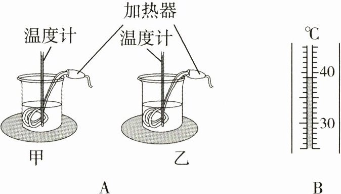 16. 在“探究不同物质的温度变化与吸热关系”的实验中,取质量和初温都相同的甲、乙两种液体,分别装入相同的烧杯中,用相同的加热器加热,如图A所示.