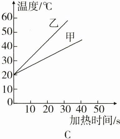 (2)由图 C 可知,加热时间相同时,吸收的热量相同,乙液体升温更高,所以甲液体的比热容大,更适合作汽车发动机的冷却液.