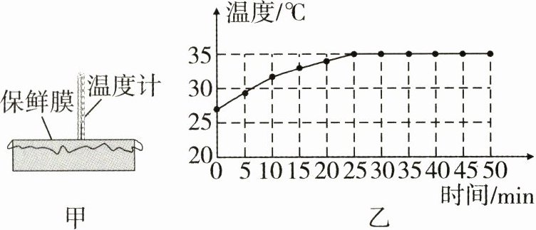 13. 晴朗的中午,小明在一个黑色的容器中装了0.1 kg的水,并用保鲜膜封住容器口(忽略蒸发),开一个小口安装了一支温度计,温度计的示数稳定后,把它放在阳光下,如图甲所示,小明每5 min记录一次温度计的示数,发现25 min之后,水的温度不再升高,其温度图线如图乙所示. 25 min后,将容器中的水继续放在阳光下,水的温度不再升高的原因可能是______________________________.