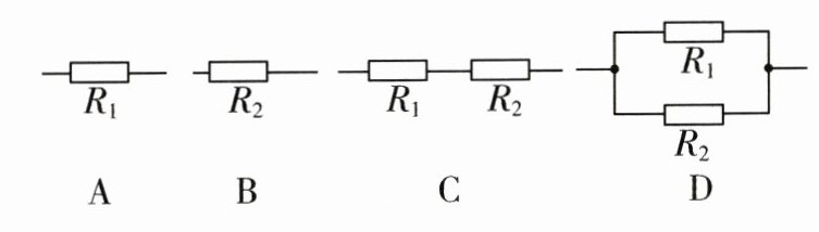 D [解析]因串联电路中总电阻等于各分电阻之和,并联电路中总电阻的倒数等于各分电阻倒数之和,所以两电阻串联时总电阻最大,两电阻并联时总电阻最小,由$I = \frac{U}{R}$可知,两电阻并联时,电路中的电流最大,故选D.