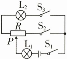 1 右 $1 : 2$ [解析]只闭合$S_1$、$S_3$时,由于灯$L_1$正常发光,由$P = UI$得,通过灯$L_1$的电流$I_1=\frac{P_{L1}}{U_1}=\frac{6\ W}{6\ V}=1\ A$,所以此时电路中电流$I = I_1 = 1\ A$,则电路总电功率$P = UI = 12\ V×1\ A = 12\ W$,由于两灯均正常发光,灯泡的实际功率与额定功率相等,所以此时滑动变阻器消耗的电功率$P_1 = P - P_{L1} - P_{L2} = 12\ W - 6\ W - 3\ W = 3\ W$;根据串联电路的电压特点可知,滑动变阻器两端电压$U_{左}=U - U_1 - U_2 = 12\ V - 6\ V - 3\ V = 3\ V$;由$I=\frac{U}{R}$可知,此时滑动变阻器连入电路的阻值$R_{左}=\frac{U_{左}}{I}=\frac{3\ V}{1\ A}=3\ \Omega$;只闭合$S_1$、$S_2$,灯$L_1$与滑动变阻器右边电阻串联,则$R_{右}=R - R_{左}=10\ \Omega - 3\ \Omega = 7\ \Omega$;由$I=\frac{U}{R}$可知,灯$L_1$的阻值$R_1=\frac{U_1}{I_1}=\frac{6\ V}{1\ A}=6\ \Omega$;根据串联电路的电阻特点可知,此时电路中总电阻$R_{总}=R_1 + R_{右}=6\ \Omega + 7\ \Omega = 13\ \Omega$;则此时电路中电流$I'=\frac{U}{R_{总}}=\frac{12\ V}{13\ \Omega}\approx0.923\ A<1\ A$;为保证灯$L_1$正常发光,应减小滑动变阻器连入电路的阻值,则滑片$P$应向右移动;由于要保证灯$L_1$正常发光,则电路总电功率$P' = UI_1 = 12\ V×1\ A = 12\ W$,所以此时滑动变阻器消耗的电功率$P_2 = P' - P_{L1} = 12\ W - 6\ W = 6\ W$,则$P_1 : P_2 = 3\ W : 6\ W = 1 : 2$.