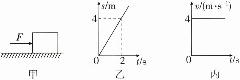 B [解析]由图乙可知,物体做匀速直线运动,速度$v_1 = \frac{s_1}{t_1}=\frac{4\ m}{2\ s}=2\ m/s$;由图丙可知,物体的速度保持不变,即物体做匀速直线运动,速度$v_2 = 4\ m/s$;因为两次都是匀速直线运动,根据二力平衡的条件可知,推力都等于摩擦力,摩擦力不变,故受到的水平推力$F_1 = F_2$;已知$v_1 < v_2$,由$P = \frac{W}{t}=\frac{Fs}{t}=Fv$可知,两次推力的功率$P_1 < P_2$,故选B.