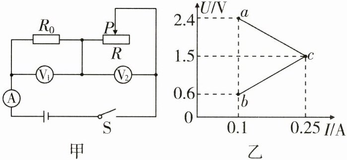 15. (多选)如图甲所示,电源电压$U$恒定,$R_{0}$为定值电阻,$R$为滑动变阻器,闭合开关S,调节滑动变阻器的滑片$P$,两电压表$V_{1}$、$V_{2}$的示数与电流表的示数变化的图象如图乙所示,则 ( )
