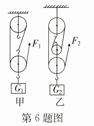 6. 甲、乙两个滑轮组如图所示,其中每个滑轮的重力都相同,用它们分别将重力为G₁、G₂的重物提高相同的高度,不计绳重和摩擦,下列说法正确的是 ( )