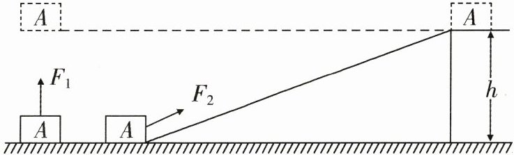 3. 如图所示,用F₁的力直接将物体A匀速提升h,F₁做功为W₁,功率为P₁;若在相同时间内借助斜面把A用力F₂匀速提升相同高度h,F₂做功为W₂,功率为P₂,斜面的机械效率是80%,则 ( )