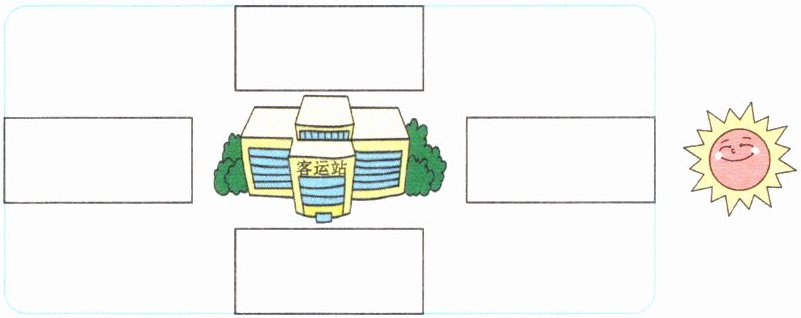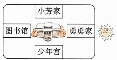 3. 周末,勇勇和同学们去露营,他们走到客运站时迷了路,太阳马上就要落山了。勇勇记得自己家在西面,小芳家在南面,图书馆在东面,少年宫在北面,请你帮他在图中找到相应的位置。