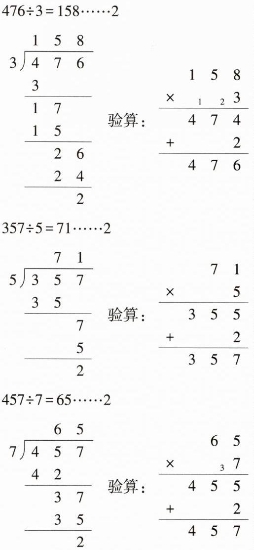 $476\div3=$ $357\div5=$ $457\div7=$