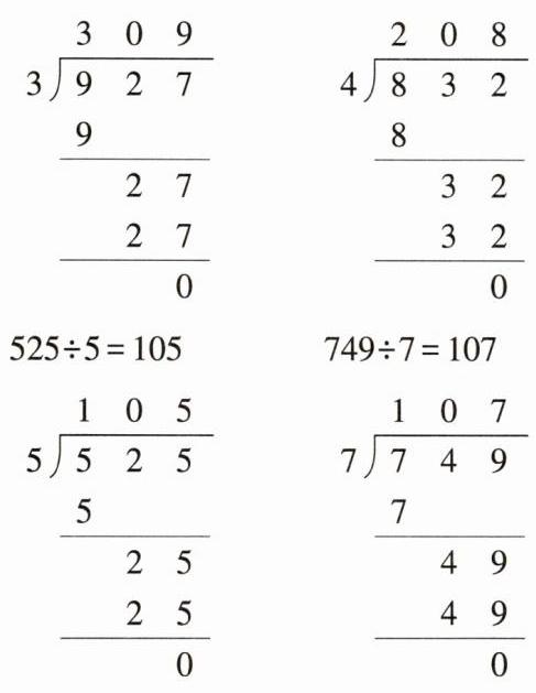 $927\div3=$ $832\div4=$ $525\div5=$ $749\div7=$