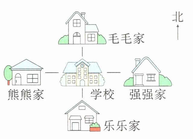 (2)乐乐家在学校的( 南 )面,强强家在学校的( 东 )面,毛毛家在乐乐家的( 北 )面。