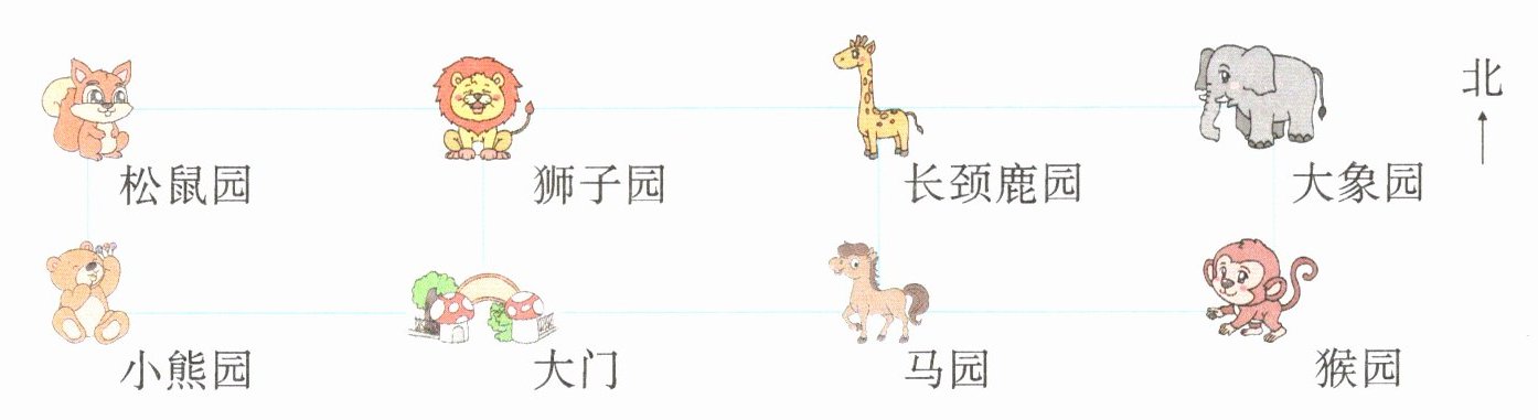 (3)( 松鼠 )园在( 小熊 )园的北面,( 大门 )园在( 马 )园的西面。