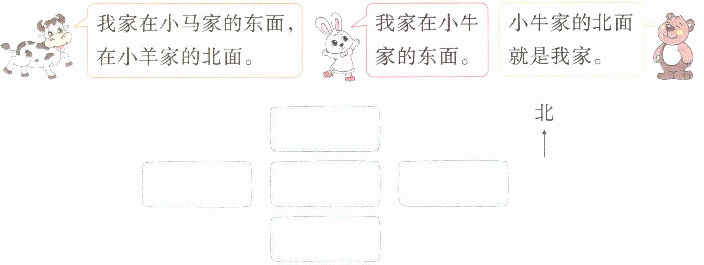 其中,图中展示了小熊家、小马家、小牛家、小羊家、小兔家的位置关系示意图,上方标有“北”指示方向。