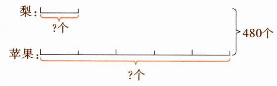 由上图可知,480个被平均分成了5 + 1 = 6(份),其中的1份就是梨的个数,再利用倍数关系或整体与部分之间的关系求出苹果的个数。