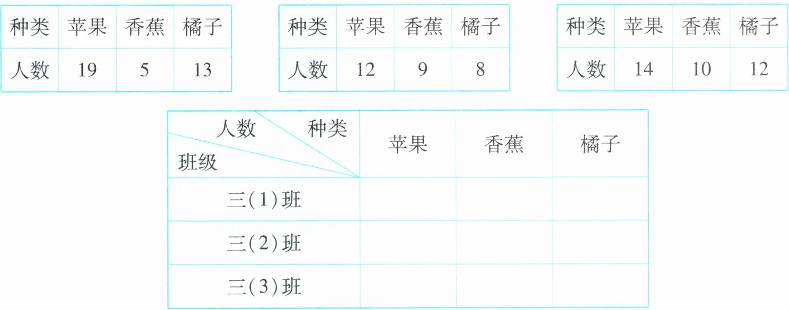 2. 下面是三年级三个班的学生最喜欢的水果情况统计表,请你将这些表格合成一个复式统计表并回答问题。
