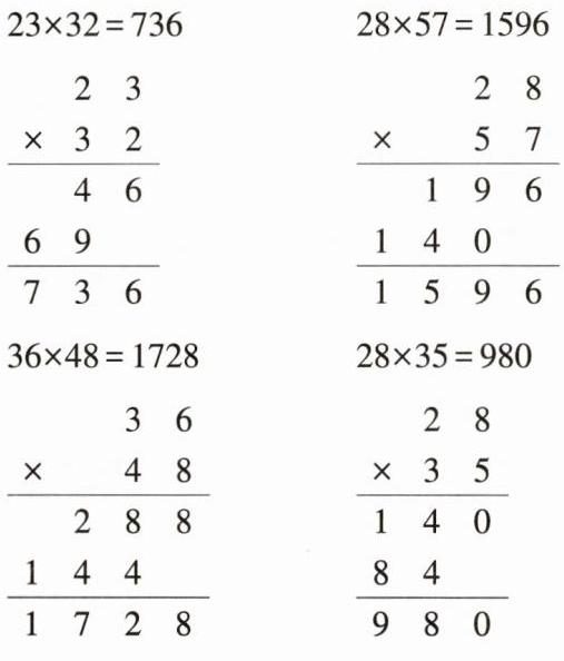 736@@1596@@1728@@980@@$\begin{array}{r}23\\×32\\\hline46\\69\\\hline736\end{array}$