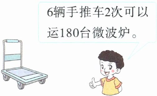 5. 8 辆手推车 4 次可以运多少台微波炉?