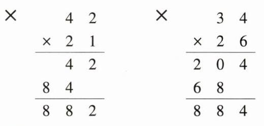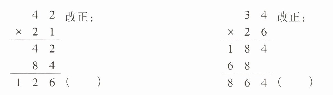 分析:第一道题中用第二个乘数十位上的数字乘第一个乘数时,得数的末位没有和第二个乘数的十位对齐。第二道题用第二个乘数个位上的数字乘第一个乘数十位上的数字后,没有加上进位的数。
