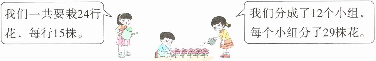 (1)$15\times24 = 360$(株),分析:要种24行花,每行15株,求一共要种多少株花,就是求24个15的和是多少,用乘法计算。