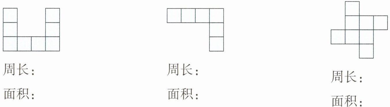 2. 下面各图形都是由边长为 1 分米的小正方形拼成的,它们的周长和面积分别是多少?