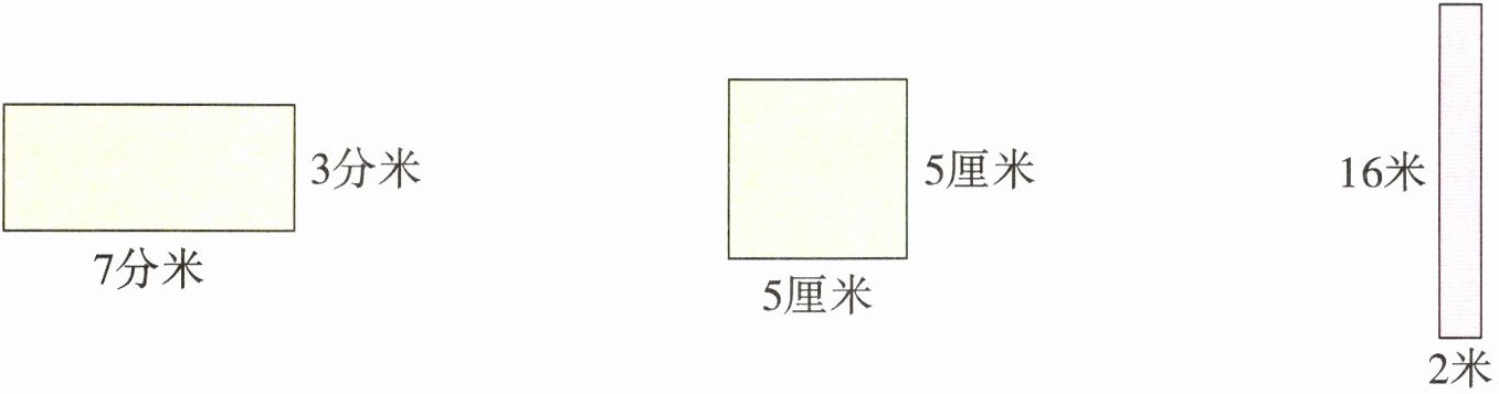 解题指导 长方形的面积 = 长×宽,正方形的面积 = 边长×边长。直接把题目中的数据代入长方形、正方形的面积公式计算出得数。