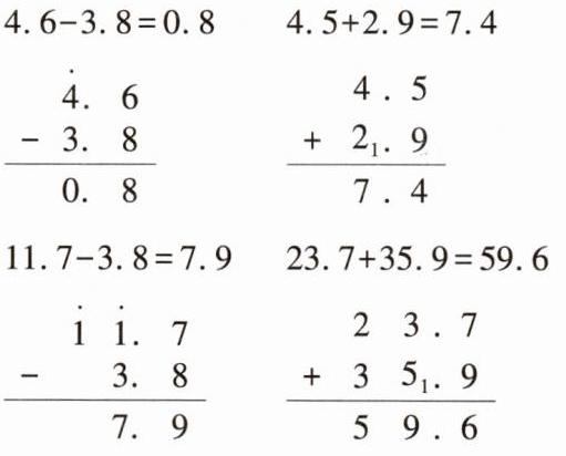 4.6-3.8= 4.5+2.9= 11.7-3.8= 23.7+35.9=