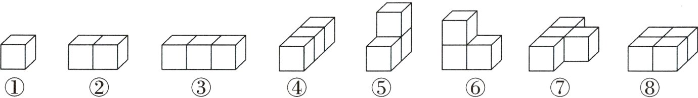 4. 下面是用一些小正方体搭成的立体图形。哪些立体图形加上1个小正方体后,从前面看到的图形可能与立体图形⑧从前面看到的图形相同?