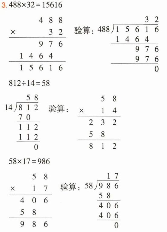 3. 计算下面各题,并利用乘、除法各部分间的关系进行验算。