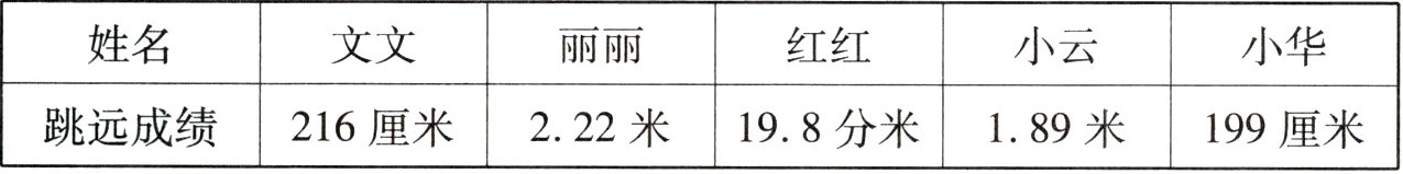 第一名:丽丽 第二名:文文 第三名:小华 分析 首先把各数量统一成相同单位的数量,把216厘米改写成用米作单位的数量,用216除以它们之间的进率100,把216的小数点向左移动两位,结果是2.16;把19.8分米改写成用米作单位的数量,用19.8除以它们之间的进率10,把19.8的小数点向左移动一位,结果是1.98;把199厘米改写成用米作单位的数量,用199除以它们之间的进率100,把199的小数点向左移动两位,结果是1.99。然后进行比较,得出第一名是丽丽,第二名是文文,第三名是小华。