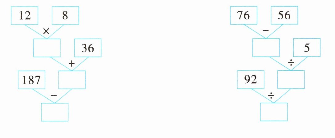 96 132 55 $187-(12\times8 + 36)=55$ 20 4 23 $92\div[(76 - 56)\div5]=23$ 分析 先算出每个框里应该填几,单独写出三个算式,然后把它们合并成一个综合算式。在列综合算式的时候为了不改变原来的运算顺序,可灵活准确地使用括号。