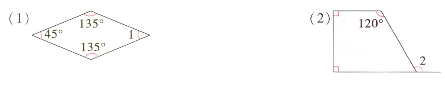 (2) 360° - 90° - 90° - 120° = 60° ∠2 = 180° - 60° = 120° 分析 四边形的内角和是360°,直角是90°。