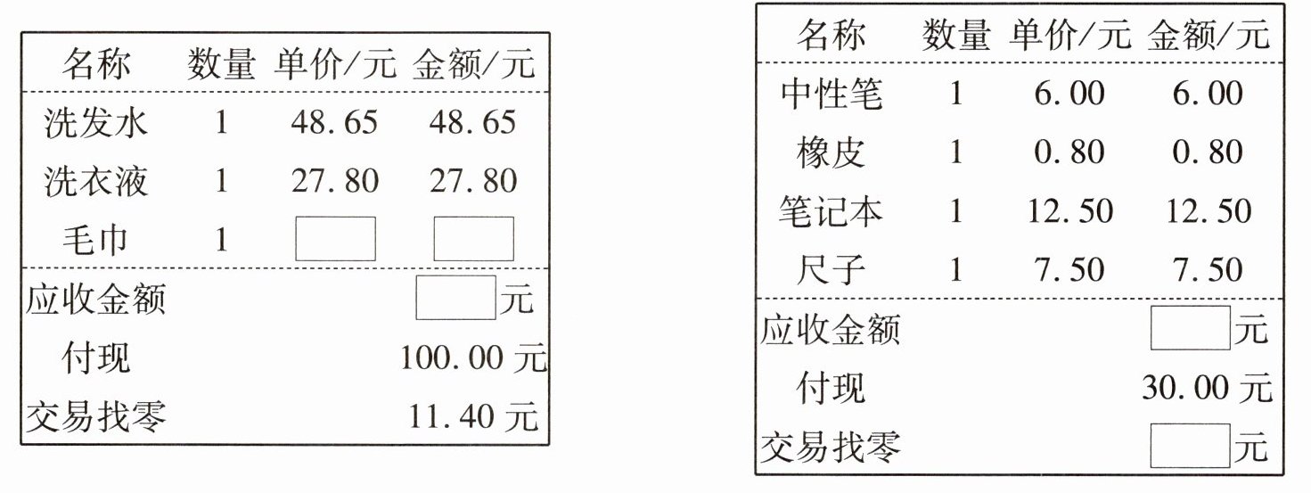 88.60(元);根据应收金额和另外两种物品的价格,求出毛巾的价格:88.60−48.65−27.80=12.15(元)。第二个表格中,根据各个物品的价格,求出应收金额:6.00+0.80+12.50+7.50=26.80(元);根据应收金额和付现金额,求出交易找零:30.00−26.80=3.20(元)。